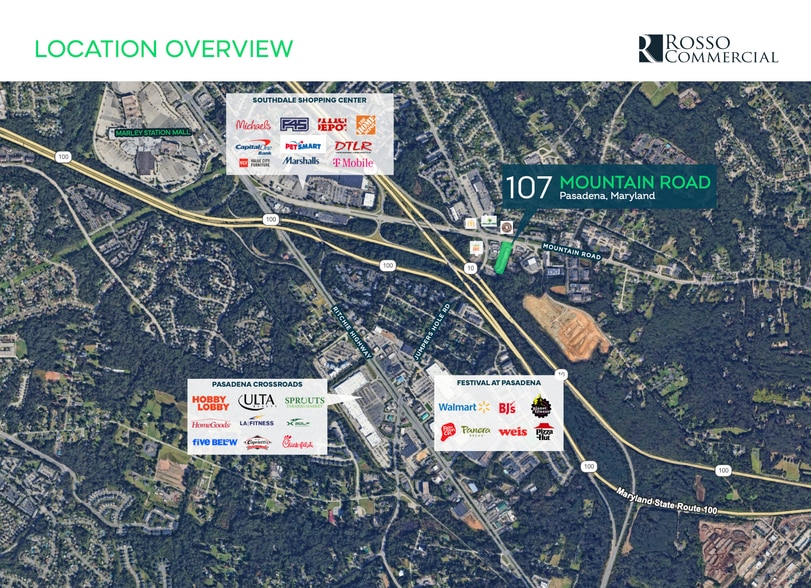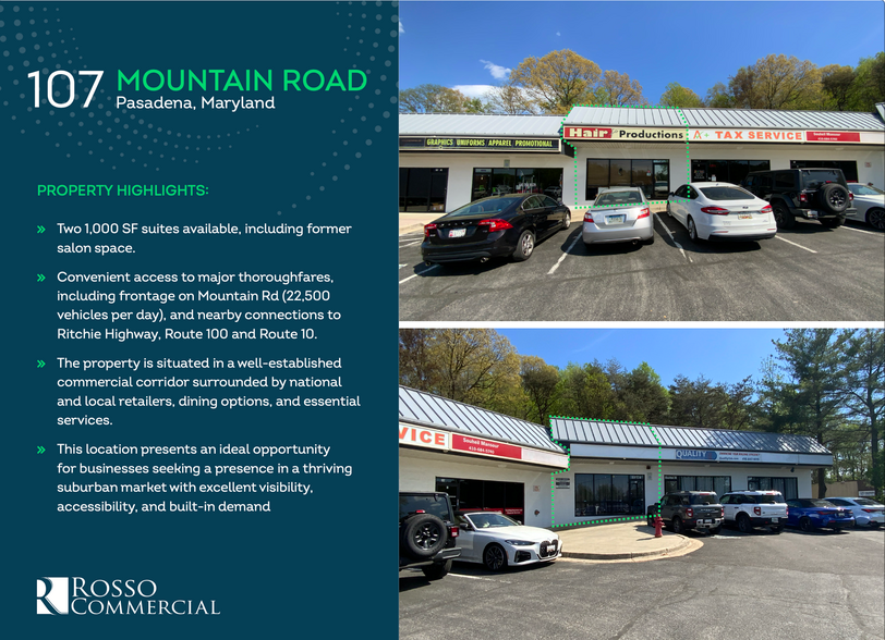 107 Mountain Road | Pasadena, MD Neighborhood Retail Center Well-positioned neighborhood retail center located along the highly trafficked Mountain Road corridor in Pasadena, Maryland. Melly's Corner is a ±23,400 SF strip center situated on approximately 2.8 acres, offering strong visibility, convenient access, and a steady, built-in customer base from the surrounding dense residential community. The property benefits from direct frontage on Mountain Road, ample on-site parking (±4.9 spaces per 1,000 SF), and seamless connectivity to major thoroughfares including MD Route 2 and MD Route 10, providing easy access throughout Anne Arundel County and the broader Baltimore-Annapolis corridor.