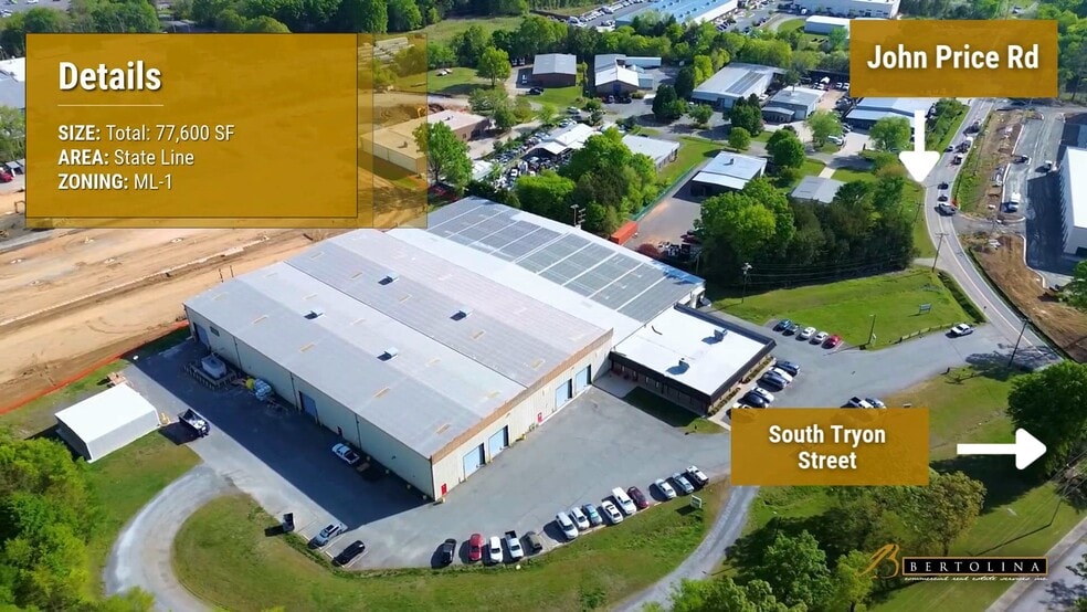 The building is a one-story industrial warehouse comprising approximately 77,600 square feet, located at 10700 John Price Road, Charlotte, NC. The structure was built in 1981 and has ML-1 zoning. It includes dock-high and drive-in doors, sprinklers, and utility service from local providers. The site is in proximity to major highways, including I-77 and I-485, as well as Charlotte Douglas International Airport.