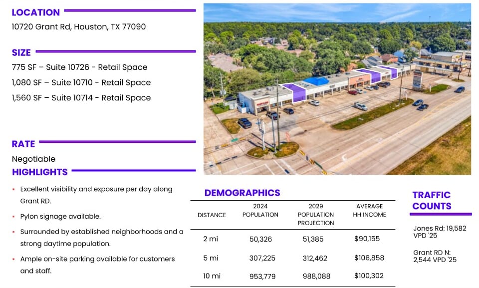 Grant Plaza offers a dynamic retail leasing opportunity in northwest Houston, located along the highly trafficked Grant Road corridor. The center features multiple available suites ranging from boutique-sized storefronts to mid-sized retail footprints, all surrounded by a diverse tenant mix including food service, beauty, wellness, and specialty retail. With daily traffic counts exceeding 19,000 vehicles on nearby Jones Road and over 950,000 residents within a 10-mile radius, the property benefits from strong visibility and consistent consumer demand. The center is anchored by neighborhood-serving tenants such as Shop N Go, Indopak Restaurant, and Champions Driving School, creating a steady draw for daily foot traffic. Pylon signage is available, offering excellent branding exposure for new tenants. The site is supported by ample on-site parking and is surrounded by established residential communities, schools, and parks, including Matzke Park and Cypress Creek High School. Grant Plaza is well-positioned for retailers seeking a high-visibility location with flexible suite sizes and competitive lease terms. Whether targeting local families, commuters, or daytime professionals, this center offers a compelling platform for growth in a vibrant Houston submarket.