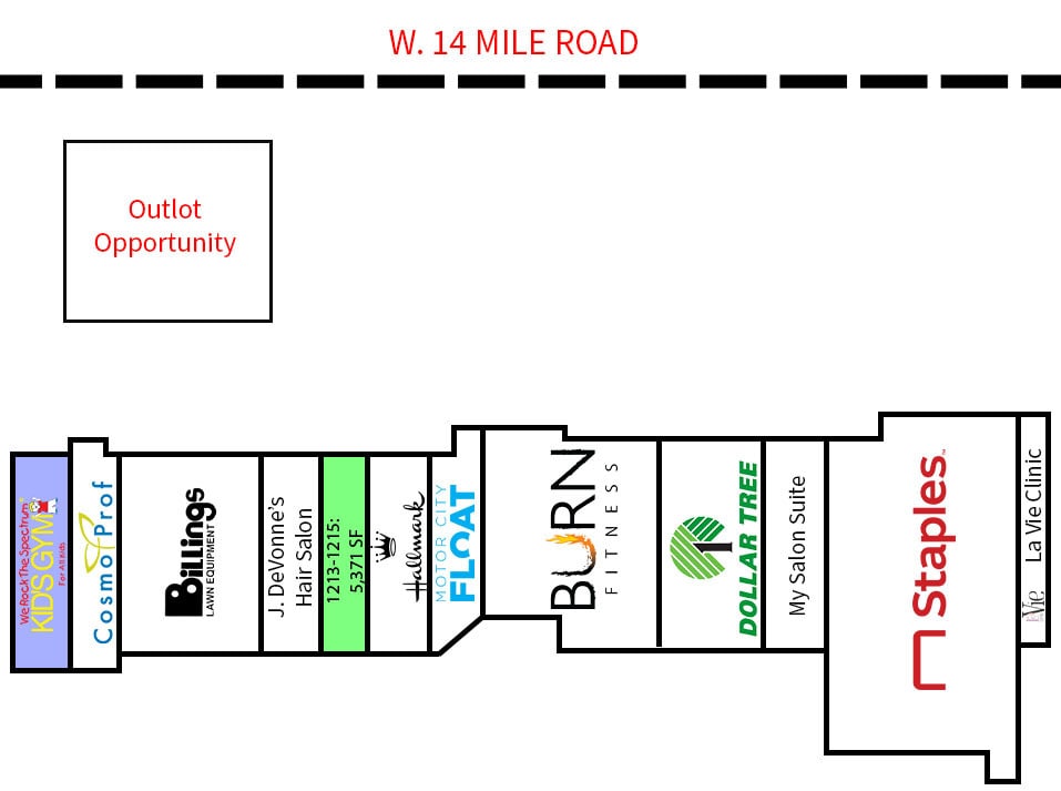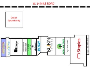 • Excellent visibility with frontage and 2 monument signs on W. 14 Mile Road • Multiple ingress/egress points for maximum accessibility • Professionally managed • Join Staples, Dollar Tree, Burn Fitness, and other national tenants in this busy center