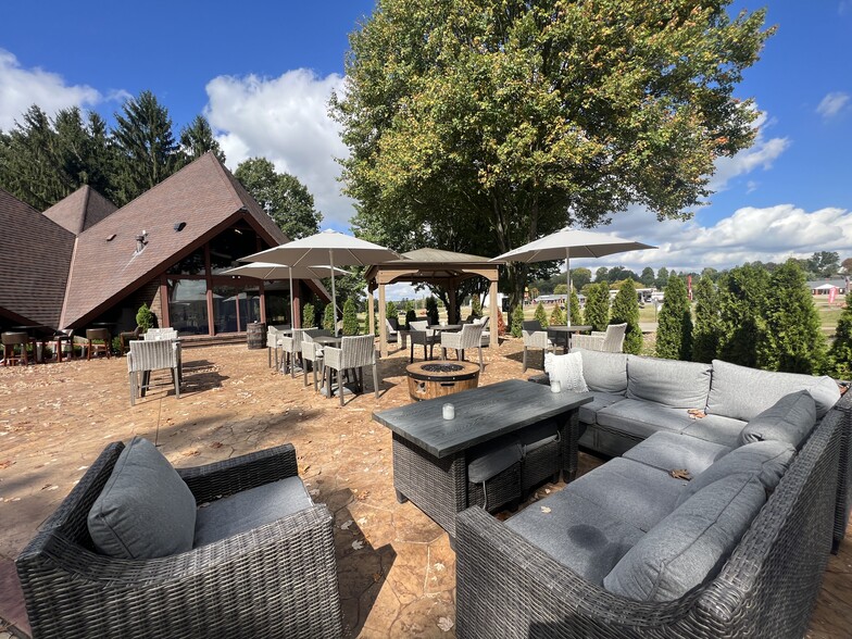 Unique 3,966 square foot commercial building with lots of updates. Spacious rooms with fresh paint throughout, newer wood laminate flooring and a fireplace. Natural sunlight fills the building with cathedral wood beamed ceiling and floor to ceiling windows providing scenic views of the property and adjacent Wilkshire Hills Golf Course. Previously set up as a winery with indoor and outdoor dining areas, and restrooms. Luxuriously updated, spacious outdoor patio with natural gas firepit. 5 gas furnaces and 4 central air units. 1200 amp electric. 1.26+/- acre level lot featuring on site, paved parking lot with 24+/- parking spaces. Excellent location in Wilkshire Hills with easy access to State Route 212 and I-77. Ideal location for your business with potential usage for office, restaurant and more.