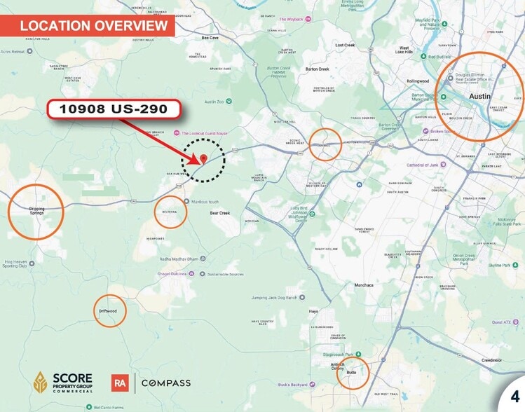 Presenting 10908 US Highway 290 — a premier 5.77-acre commercial property strategically positioned at the high-traffic corner of Hwy 290 and Fitzhugh Road in the booming Austin–Dripping Springs corridor. Currently home to Edgestone Automotive and Malco Electric, this site combines stable income with exceptional future development upside.