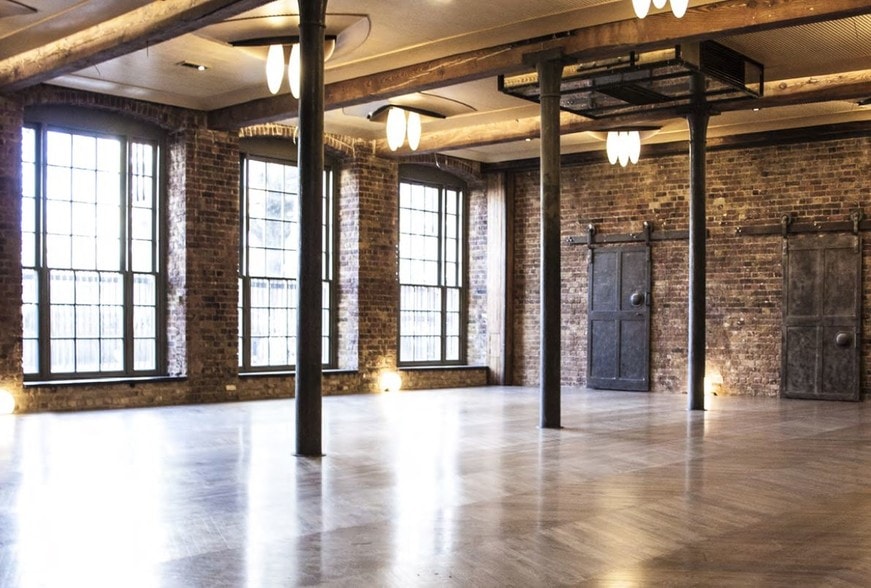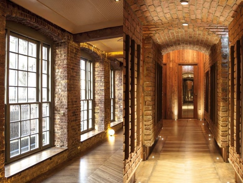 - Large industrial windows, exposed brickwork & wood panelled walls