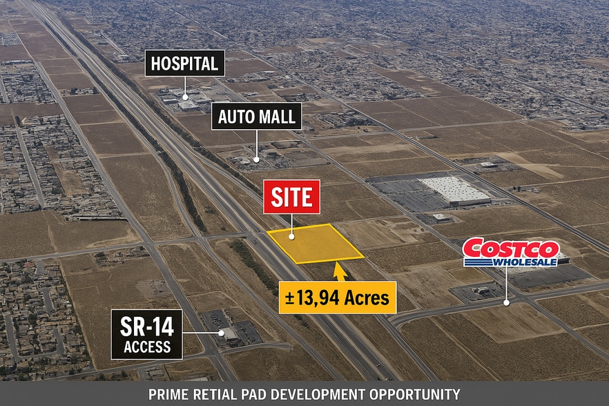 Prime retail pad site at the signalized corner of Palmdale Blvd & 10th St W, adjacent to Costco, Target Home Depot with immediate SR-14 access. ±13.94 acres offering strong frontage, visibility, flexible pad development for QSR and national tenants.