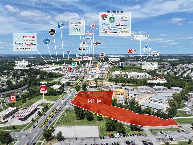 This property is vacant land at the signalized intersection of 10th Street and Vissing Park Road. Two lots are available for lease or build-to-suit: Lot 1 (1.61 ± Acres) and Lot 3 (1.27 ± Acres). Lot 3 is also available for sale ($800K). There are over 23,000 VPD on 10th Street in front of the site and this is located at the last light before the Interstate 265 interchange. With the extension of the interstate 265 bridge, Jeffersonville, Indiana is the fastest growing Southern Indiana market. Major retailers in the area include Meijer, Kohl's, Kroger, Walgreens, and Rural King.