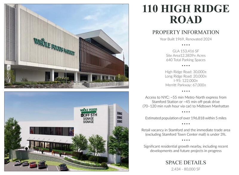 Year Built 1969, Renovated 2024. Access to NYC: ~55 min Metro-North express from Stamford Station or ~45 min off-peak drive (70–120 min rush hour via car) to Midtown Manhattan. Estimated population of over 196,818 within 5 miles. Retail vacancy in Stamford and the immediate trade area (excluding Stamford Town Center mall) is under 3%. Significant residential growth nearby, including recent developments and future projects in progress.