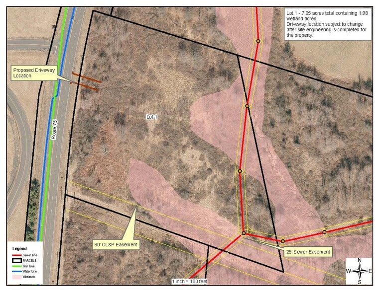 Recently subdivided Town owned lot for sale. Topography slopes away from the road to a level area. Conceptual site plan indicates up to 25,750 SF building with associated loading and parking may fit on the site.