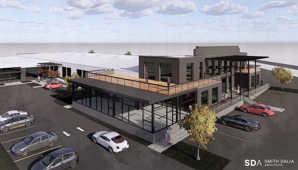 The property consists of six remodeled warehouse buildings and one newly constructed building that together form a mixed-use site supporting office, retail, showroom, and food-and-beverage uses. The layout includes outdoor areas such as patios and open green space that can accommodate general circulation and tenant-adjacent exterior use. Surface parking is available on site. The property is located within proximity to multiple surrounding neighborhoods and is situated near major regional destinations including Uptown, South End, interstate corridors, and the airport, with distance markers shown for reference.