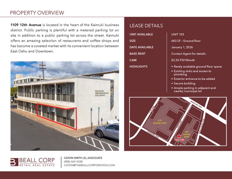 1109 12th Avenue is located in the heart of the Kaimuki business district. Public parking is plentiful with a metered parking lot on site in addition to a public parking lot across the street. Kaimuki offers an amazing selection of restaurants and coffee shops and has become a coveted market with its convenient location between East Oahu and Downtown.