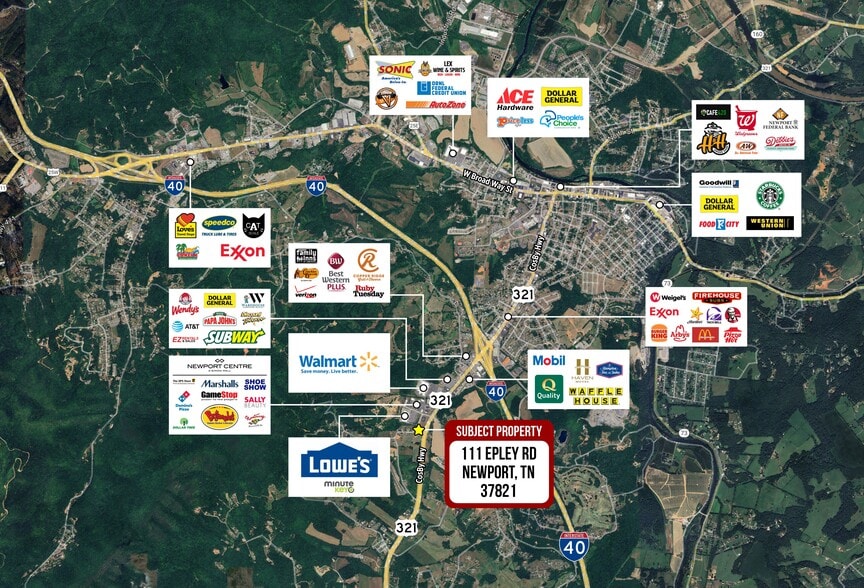 Positioned for maximum visibility and accessibility, this 1.17-acre commercial outparcel at 111 Epley Road, Newport, TN offers an exceptional opportunity to lease a brand new building next to a major national coffee brand. Fronting Hwy-321 and providing immediate access to I-40, the site is strategically located in a high-traffic corridor with counts exceeding 30,000 vehicles daily on I-40 and over 21,000 on US-321. Zoned C-3, the property supports a wide range of commercial uses, making it ideal for retail, dining, or service-oriented businesses seeking strong exposure and convenience. Surrounded by established national retailers and hospitality brands—including Lowe’s, Walmart, Marshalls, Cracker Barrel, and Holiday Inn Express—the site benefits from a robust trade area and complementary co-tenancy. Demographics within a 10-mile radius reflect a population of over 40,000 and an average household income exceeding $62,000, ensuring a solid customer base for future tenants. With flexible development options and a prime location in Newport’s growing commercial corridor, this property offers unmatched potential for businesses looking to capitalize on visibility, traffic, and regional connectivity.