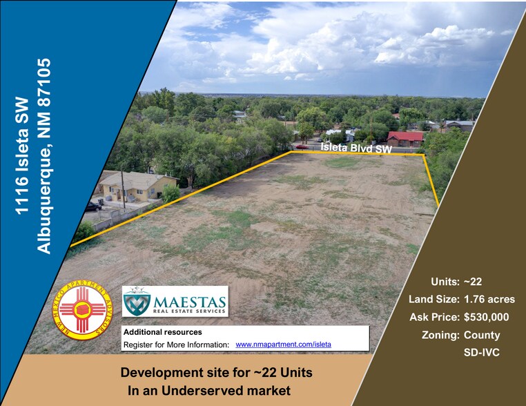 NM Apartment Advisors and Maestas Realty are excited to bring to market a well located potential apartment development site as 1116 Isleta SW.