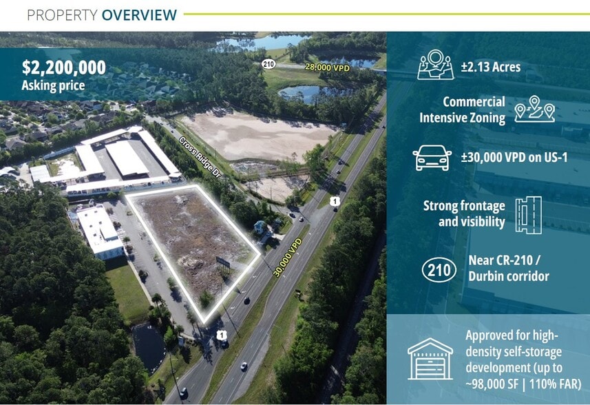 ±2.13-acre commercial development site located along US-1 in Ponte Vedra, FL, offering strong frontage, visibility, and access within the rapidly growing Durbin Corridor. The property is fully entitled for high-density self-storage development, allowing for up to approximately 98,000 square feet (110% FAR). Entitlements include a comp plan amendment, concept site plan, and preliminary geotechnical work, significantly reducing development timeline and risk.
