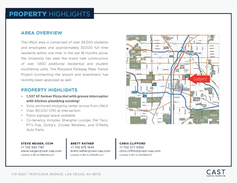 The UNLV area is comprised of over 34,000 students and employees and approximately 30,000 full time residents within one mile. In the last 18 months alone, the University has seen the brand new construction of over 1,800 additional residential and student multifamily units. The Maryland Parkway Mass Transit Project (connecting the airport and downtown) has recently been approved as well.