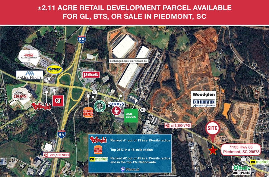 This 2.11-acre site offers a versatile opportunity for ground lease, build-to-suit, or sale within Piedmont’s rapidly expanding retail corridor. Positioned on the outparcel of a newly developed self-storage facility, the property benefits from multiple points of full shared access and will be delivered rough graded with shared stormwater detention already in place. The surrounding area is experiencing strong growth, with a 2.9% annual population increase within a one-mile radius and approximately 2,000 new housing units planned or currently under construction nearby, creating a solid foundation for future retail demand. The site is also supported by a strong lineup of national and regional retailers, including Starbucks, Bojangles, Pilot Travel Center, Spinx, QuikTrip, Burger King, Truist, Walgreens, O’Reilly Auto Parts, and Dollar Tree. Traffic counts continue to rise, with a 31% increase in vehicle per day counts on Highway 86 since 2020 and approximately 91,100 vehicles per day on Interstate 85, underscoring the site’s high visibility and accessibility. Pricing is available upon request through the broker.