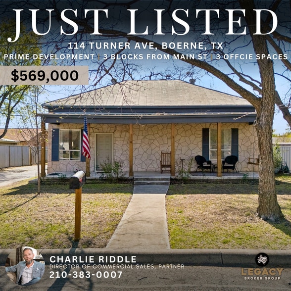 114 Turner Ave is a great 3 office open floor plan with high ceilings, great ambient light on a larger city lot. This property is perfect for professional office, light professional/medical services, hair or nail salon or simply as an investment. This property is dual purpose, meaning it is currently a residence but has recently received C2 Commercial zoning which makes the investment aspects of this property unique. By far the best part about 114 Turner is its location, in the center of historic downtown Boerne. Just 3 blocks from Historic Main and two blocks from Blanco Ave. Call Charlie Riddle today for more details 210.383.0007