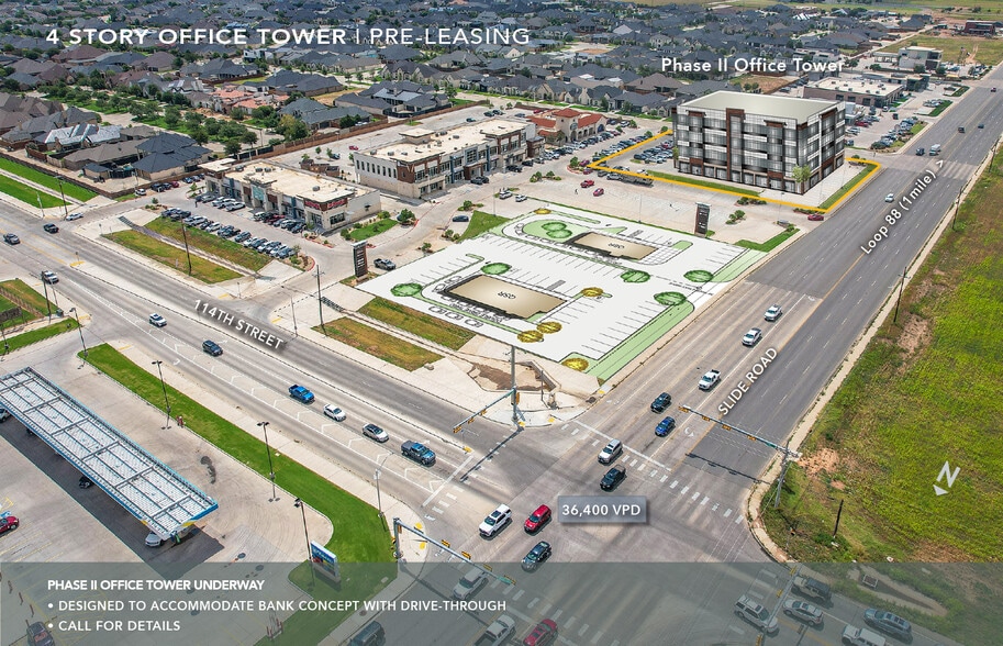 Position your company within Lubbock’s most active south growth corridor at 114th & Slide Road. This planned four-story Class A office development will deliver approximately 54,000 square feet of modern, scalable office space designed to accommodate both single-tenant headquarters users and multi-tenant configurations. Strategically located between Loop 289 and the future Loop 88 (currently under construction), the property offers exceptional regional accessibility, strong traffic exposure (36,400 VPD), and proximity to Lubbock’s fastest-growing residential and executive neighborhoods. The building sits within The Shops at 114.Slide, a ±70,000 SF mixed-use development adjacent to United Supermarkets and complemented by established retail, dining, and wellness users. Just six blocks away, the newly developed 250,000 SF UMC Health & Wellness Hospital further reinforces the corridor as a premier destination for professional and medical office users. • Pre-leasing opportunities with flexible floor plates • Full-floor or multi-tenant configurations available • Prominent corporate signage potential • Approximately 600 shared parking spaces with room to expand • Excellent ingress/egress and signalized access • High-income trade area ($182,000+ HH income within 1 mile) This location provides companies the opportunity to establish a headquarters presence within a professionally planned environment surrounded by healthcare, retail, financial, and residential growth — positioning tenants for long-term visibility and expansion in one of Lubbock’s strongest performing corridors.