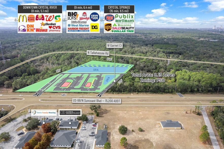 The 8.18-acre site lies entirely within FEMA Flood Zone X (Shaded), meaning it is outside the 100-year floodplain and carries no FEMA-driven elevation, fill, or flood insurance requirements. The absence of AE or A flood zones within the property boundary ensures minimal flood risk, lower sitework costs, and a straightforward entitlement path, making the tract ideally suited for retail, QSR, medical, hospitality, and multifamily development. Estimated Fill Volume (Frontage Pads Only) 1.0 ft lift ? ~7,000–8,500 CY 2.0 ft lift ? ~14,000–17,000 CY 2.5 ft lift ? ~18,000–21,000 CY Final numbers depend on site grading, access drive placement, stormwater pond location, and pad layout. Interior Tract Balancing Interior portions of the site typically require: 0.5 – 1.5 ft of balancing to create uniform building pads or roadway subgrades, depending on use (hotel, medical office, multifamily, etc.). Net Fill Requirement – Planning Level Estimate Based on the assumptions above: Low-Case Scenario (ideal cut-to-fill balance) -Frontage lift: ~7,000 CY -Interior balancing: ~5,000 CY -Pond cut offset: –8,000 CY -Net imported fill: ~4,000 CY (Extremely efficient site) Mid-Case Scenario (typical for US-19 corridor) -Frontage lift: ~14,000 CY -Interior balancing: ~8,000 CY -Pond cut offset: –7,000 CY -Net imported fill: ~15,000 CY High-Case Scenario (if pads require 2.5–3 ft lifts) -Frontage lift: ~21,000 CY -Interior balancing: ~12,000 CY -Pond cut offset: –5,000 CY -Net imported fill: ~28,000 CY Citrus County: A Market Poised for Growth Citrus County, currently home to 153,600 residents, is on track for exponential growth, with the population projected to reach 350,000 by 2030 under the County’s Land Development Code. As part of the Tampa–St. Petersburg–Clearwater Metropolitan Statistical Area (MSA)—the 18th largest MSA in the United States—Citrus County continues to attract both businesses and residents. Lecanto and its surrounding areas have benefited from recent revitalization efforts, including community investments such as the Liberty Park and Depot District in Inverness. The recently completed $135 million expansion of the Suncoast Parkway and its planned extensions will further enhance connectivity, fostering additional economic growth. Within a 15-minute drive, the property serves a substantial customer base of 46,361 residents, with an average age of 58 and a median household income of $65,000. This demographic ensures a solid foundation for businesses seeking to establish or expand in a thriving and dynamic market. This meticulously maintained retail and service plaza presents an unparalleled opportunity for businesses to thrive in a high-traffic, high-visibility location, surrounded by a strong customer base and an array of complementary national retailers. Logistic Details: -County Road 486 runs entirely along West Norvell Bryant Highway. It runs West to East from SR 44 east of Crystal River into US-41 in Hernando, just south of the southern terminus of SR 200. The route was once the former SR 486. County Road 486 spans 4 lanes, is almost entirely a divided highway, and is flanked by a parallel bicycle path on the south side. -County Road 491 is Lecanto Highway, a bi-county South to North road that begins at the Hernando-Citrus County Line in Oak Grove near the Withlacoochee State Forest and ends at SR 200 in Stoke's Ferry, just south of the intersection with the northern segment of CR 39. It was formerly designated as SR 491. -County Road 44 (often marked as County Road 44W) exists as the western tip of old Florida State Road 44, south of "Downtown" Crystal River. The suffix "W" was most likely added to not confuse this section with State Road 44, to the north, and to show its location by being west of US 19 and US 98(SR 55). As with the majority of these types of 'coastal spur' routes, in West Central Florida, it is county-maintained. -U.S. Route 19 (US-19) runs 264 miles (425 km) along Florida's West Coast from an interchange with U.S. Route 41 in Memphis, Florida, south of Tampa, and continues to the Georgia border north of Monticello, Florida. Newly 6 lane Highway was constructed from the Hernando County line to Fort Island Trail and US 19 in Crystal River, Florida. Suncoast Parkway: The Suncoast Parkway recently opened was a $135 Million Dollar expansion that extends 13 miles north from US-98 to SR 44 which features 15 new bridges, electronic tolling gantries, and the extension of The Suncoast Trail part of the Florida's Statewide Greenways and Trail System. The Suncoast Parkway is just 68 Miles 1 hour and 15 mins from Tampa making it a great commuting Highway for the workforce seeking to be outside of the Tampa traffic. The Veterans Expressway and Suncoast Parkway is a north–south toll road near the Florida Gulf Coast. Maintained and operated by Florida's Turnpike Enterprise, this 68-mile transportation corridor extends from State Road 60 in Tampa, north to State Road 44 near Lecanto. Citrus County Growth: Citrus County, Florida's estimated population is 155,582 with a growth rate of 1.29% in the past year according to the most recent United States census data. Citrus County, Florida is the 34th largest county in Florida. The 2010 Population was 141,173 and has seen a growth of 10.21% since this time. Citrus County's current LDC allows for approximately a population of 350k residencies. Given the expansion of the Suncoast Parkway and the 6-lane expansion of US 19, we are in the path of tremendous growth. +Currently, Citrus County has 60,000 vacant parcels of land prime for development. The County and incorporated Cities have plans for extensive utility expansion throughout the county including the expansion of the Crystal River Airport Runway 5000 feet to allow for larger aircraft to land and take off including a newly funded 75 acres industrial complex granted by the state to expand utilities, road reconstruction to support eighteen wheelers and to include 