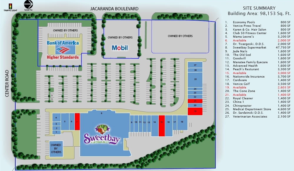 Venice’s most active and prime end cap retail centers. Located at the high-traffic intersection of Center Road and Jacaranda Boulevard, this 97,000-square-foot shopping center benefits from exceptional visibility and accessibility, with direct connections to both Route 41 (Tamiami Trail) and Interstate 75. The plaza is anchored by a strong mix of national and regional tenants including Winn Dixie, Center for Sight, You Fit Health Clubs, Peach’s Restaurant, and Papa Leone’s, creating a steady stream of foot traffic throughout the week.