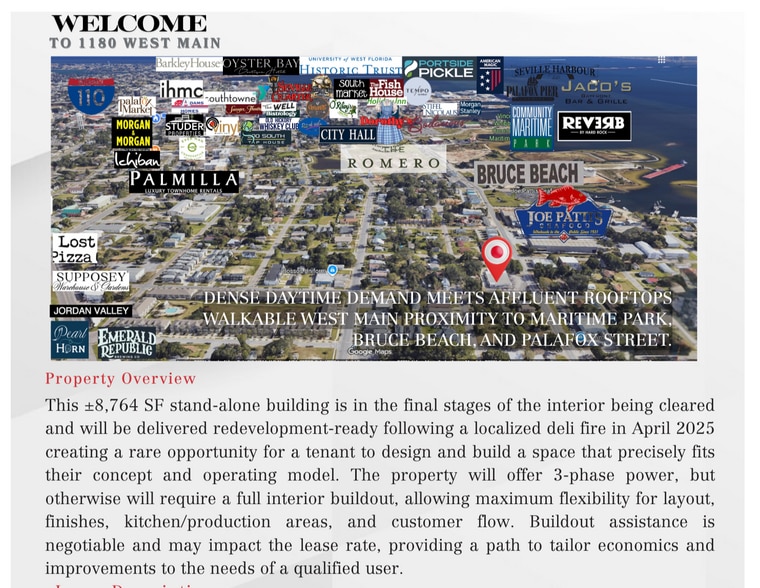 Former Shoreline Grocery- Redevelopment Ready Shell The iconic Shoreline Food and Deli operated in this location for 46 years until a localized deli fire Today the ±8,764 SF stand-alone building is in the final stages of being cleared and will be delivered redevelopment-ready, creating a rare opportunity for a new user to design a purpose-built space around their business concept and operating model. The property will offer 3-phase power; otherwise, it is a full interior buildout, allowing maximum flexibility for layout, finishes, and customer flow. Buildout assistance is negotiable and may impact the lease rate, providing a path to align improvements and economics for a qualified tenant. Positioned at a lighted corner along the rapidly expanding West Main Street corridor, 1180 Main Street offers a rare chance to reimagine a proven commercial location just minutes from Downtown Pensacola and Palafox Street. Nearby demand drivers include a 282-unit luxury apartment development (The Romero) currently underway on Main Street (expected to increase residential density), proximity to Blue Wahoo's Stadium and its steady event/seasonal traffic, the upcoming Hard Rock REVERB project at Maritime Park, upcoming 184 room Tempo by Hilton Hotel at the former New World Landing, and the Pensacola Yacht Club, which contributes an additional affluent customer base