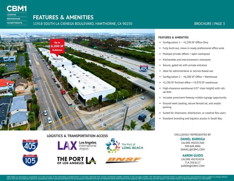 Now available for sublease—versatile office and warehouse space strategically located at the 405/105 interchange in Hawthorne. Two flexible configurations are available: ±2,230 SF of turnkey office, or ±6,200 SF combining the same finished office with ±3,970 SF of high-ceiling warehouse. The larger configuration includes rare freeway-visible signage directly along the 405, offering premium exposure to tens of thousands of vehicles daily. Ideal for administrative, showroom, creative industrial, or light logistics users. Secure gated lot, functional layout, and immediate occupancy. Located at 11918 S La Cienega Blvd, the property offers immediate access to the 405 & 105 freeways, placing you minutes from LAX, the Port of LA/Long Beach, and key South Bay industrial corridors. Nearby neighbors include major corporate, logistics, and manufacturing users. With over 13,800 vehicles passing daily on La Cienega and even more on the adjacent freeways, this space delivers both access and visibility for your brand. Configuration 1 – ±2,230 SF Office-Only -Fully built-out, move-in ready professional office suite -Multiple private offices + open workspace -Kitchenette and men’s/women’s restrooms -Secure, gated lot with private entrance -Ideal for administrative or service-based use Configuration 2 – ±6,200 SF Office + Warehouse -±2,230 SF finished office + ±3,970 SF warehouse -High-clearance warehouse (±27’ clear height) with roll-up door -Includes prominent freeway-visible signage opportunity -Ground-level loading, secure fenced lot, and ample parking -Suited for showroom, distribution, or creative flex users -Excellent branding and logistics access in South Bay