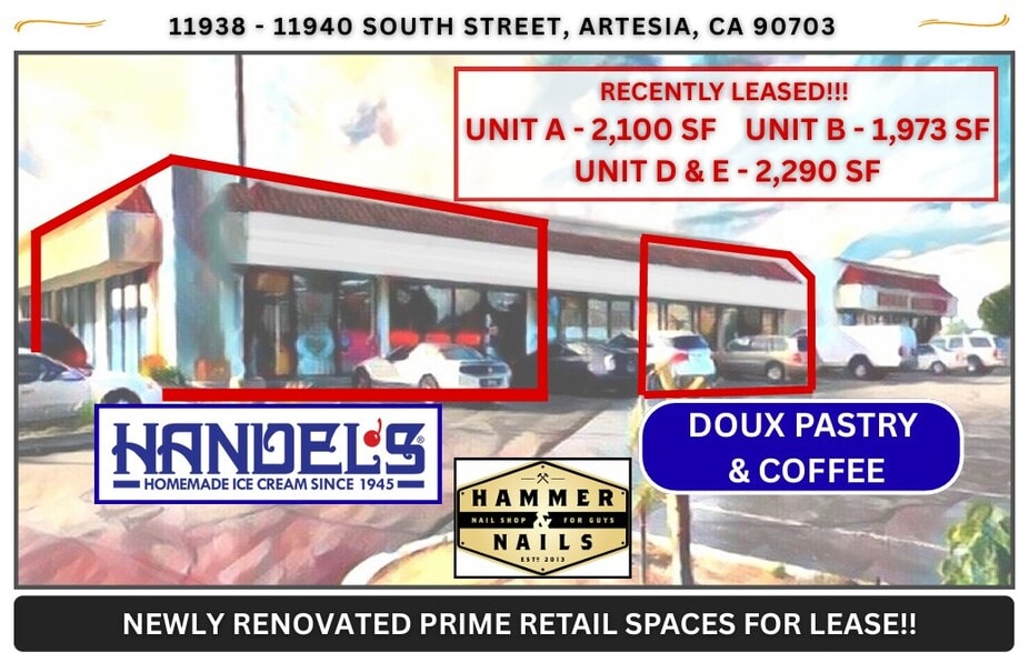RECENTLY SIGNED LEASES!! UNIT A - 2,100 SF - HANDELS ICE CREAM - COMING SPRING 2026!! UNIT D & E - 2,290 SF - DOUX PASTRY & COFFEE! - COMING SPRING 2026!! RECENTLY SIGNED LEASES!! UNIT B - 1,973 SF - HAMMER & NAILS MENS GROOMING - COMING SUMMER 2026!! TWO (2) - 1,600 +/- SQUARE FOOT SPACES AVAILABLE! UNIT C & UNIT F! Welcome to 11938 11940 South Street, Artesia, CA, an outstanding retail property for lease in Southeast Los Angeles County with new construction status and premier visibility. This retail center is being designed to cater to food & beverage, boutique retail, and experiential concepts, anchored by Handel’s Ice Cream and a gourmet pastry and coffee café — setting a strong base of customer draw. This opportunity offers: • Flexible suite sizes & tenant improvement options, allowing build to-suit layouts to match your concept. • Corner, signalized frontage on South Street, granting maximum exposure and easy access. • High-traffic demographics & pedestrian synergy, with complementary customers drawn to the café and dessert anchor. • Well-designed parking and circulation, with sufficient stalls, driveways, and convenient ingress/egress for retail customers. • Modern infrastructure & utility hookups, ideal for restaurant, café, or specialty retail buildout. • Co tenant mix targeting a similar customer base, positioning your business alongside high engagement uses. This retail center aims to attract tenants who enhance the customer experience: think artisan bakeries, dessert bars, fast-casual eateries, boutique fitness studios, wellness / spa, gourmet food retailers, or specialty shops. With synergy from Handel’s Ice Cream and a gourmet café already in place, your concept can tap into an existing stream of foot traffic and shared consumer interest. Whether you’re an independent operator or regional brand, this location offers a compelling platform to build your presence in a densely populated retail corridor. Retail space for lease in Artesia / South Los Angeles County is limited — this new project delivers an exceptional opportunity to plant roots in a growing market. Contact us today to discuss suite availability, TI allowances, and lease terms.