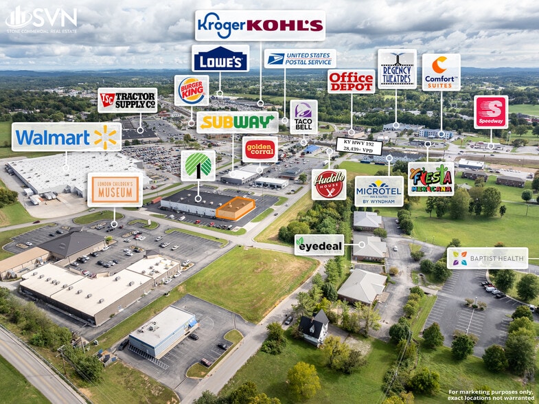 SVN Stone Commercial Real Estate is pleased to offer this excellent end cap opportunity located in a Walmart Shadow-anchored Strip Center in London, Kentucky. This 23,904 square-feet strip center is anchored by Dollar Tree and Hibbett Sports, as well as Sally Beauty and Game Stop. Suite 120 is a 2,000 SF end cap with ample parking and excellent visibility. Please contact Weston Lockhart at 859.317.3538 // weston.lockhart@svn.com or Caleb Cleveland at 859.556.4857 // Caleb.cleveland@svn.com