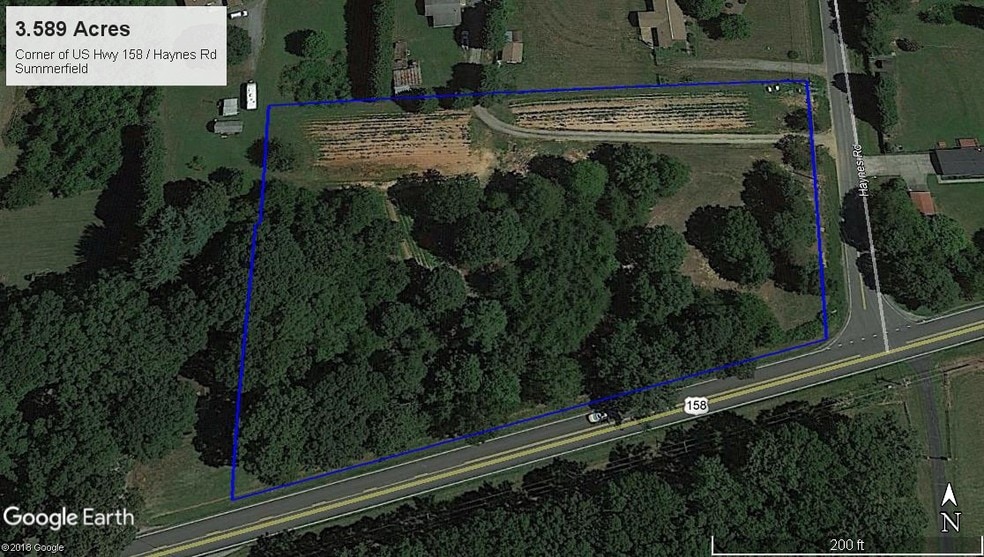3.07 acre lot on west corner of US158 and Haynes Rd in Summerfield. The majority of the lot has a wide range of tree sizes and a small portion of it is cleared and currently farmed by the neighbors.