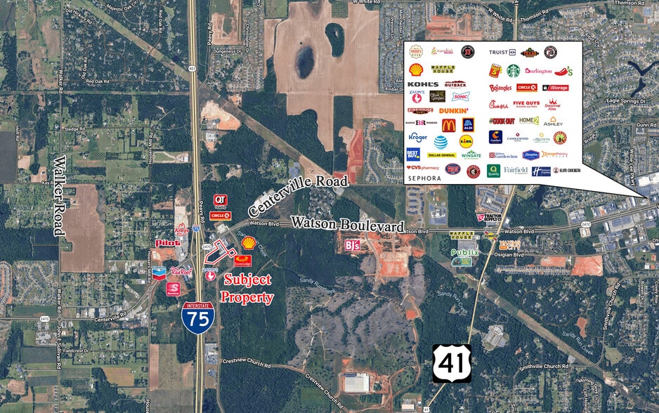Strategically located at the intersection of Interstate 75 and Watson Boulevard (Highway 247 Connector), the property offers immediate access to a major north-south corridor with strong visibility along one of the area’s primary commercial routes. The site is just minutes from Robins Air Force Base and is surrounded by a mix of established retail, lodging, and expanding residential development, supporting continued growth and long-term demand in the corridor.