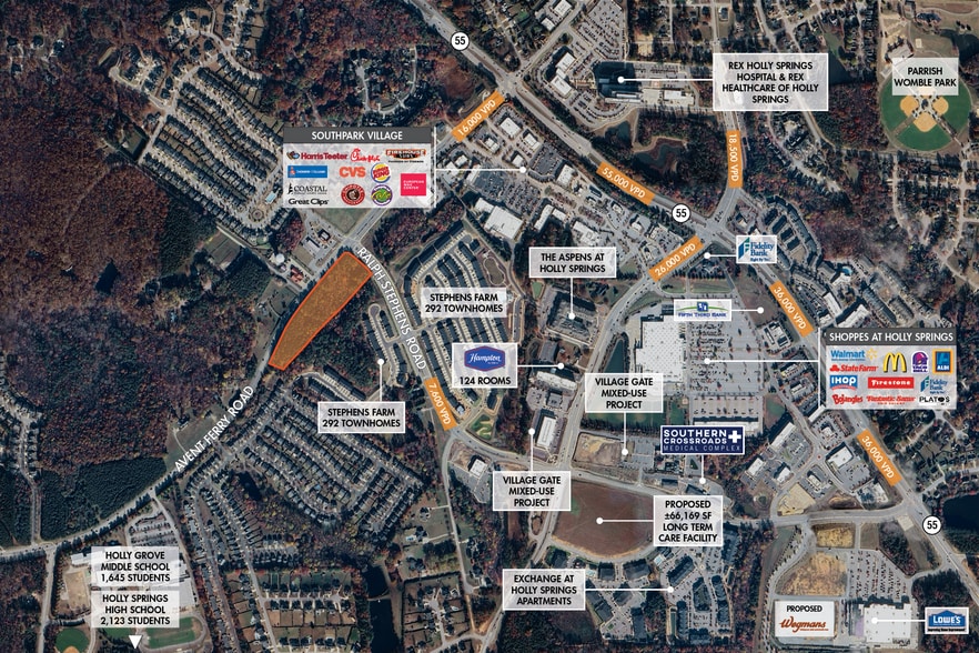 Raw, level land located in the heart of Holly Springs, NC. Property is at a signalized intersection and boasts over 1,000 feet of frontage on Avent Ferry Road.