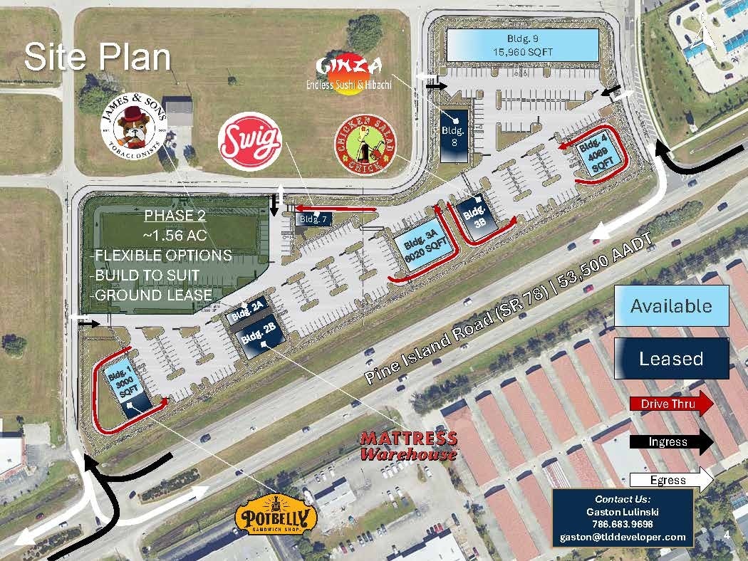Shops at Del Sol New retail development on Pine Island Road between NE 10TH Place & NE 13th Ave.? Less than a mile from Del Prado Boulevard.? Call: 786.683.9698 Email: gaston@tlddeveloper.com Delivery: Q1 2026 Total GLA: 64350 SF Join: Potbelly, Swig, Chicken Salad Chick, Mattress Warehouse, James & Sons Tabacconist & Ginza Building 1: 3000 SF Available Building 3A (Drive Thru): 6020 SF Available Building 4 (Drive Thru): 4063 SF Available Building 9: 15960 SF Available Phase 2: (1.5 Acre Pad with flexible Delivery) 1,000 FT Frontage on Pine Island Road (53,500 AADT) Signage available (building & pylon) Ample parking Commercial zoning Proposed use: drive thru, grocer, QSR, restaurants, retail, office, medical and service-related users, hotel, and more