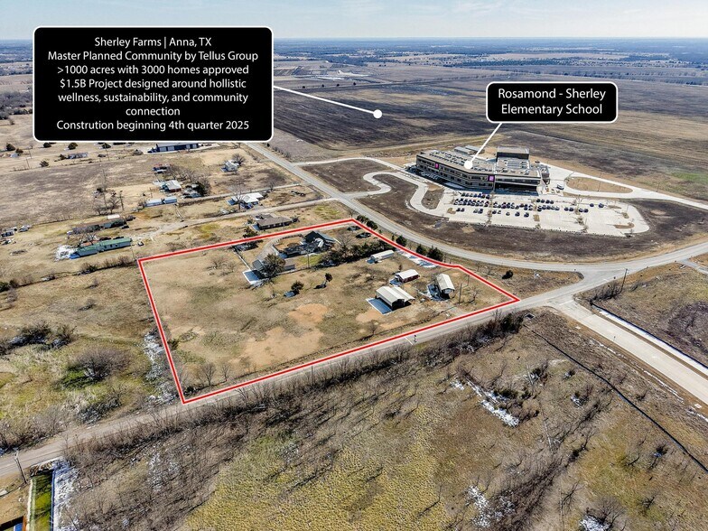 Highly unique hard corner across from new Elementary school, and across from 1000 AC Sherley Farms SFR development to consist of 3000 SFR homes at full build out. Sherley Farms is currently under construction. Subject 4 AC is in Anna ETJ, no city limits; subject does have access to significant water and sanitary sewer lines. Opportunity here for Owner or Tenant to utilize the 4 AC with all improvements for residential and/or business (industrial and/or commercial) purposes. Industrial storage yard, auto parking, landscape operation, Irrigation operation, etc--- all can be supported here. Subject sits at a hard corner that is to be a future major intersection. Call broker to discuss further Whisenant Properties Preston Whisenant 214-435-7394