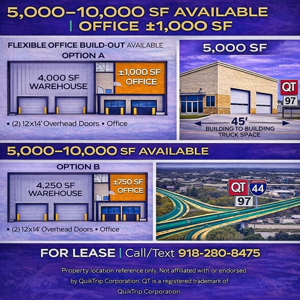 - Flexible ±5,000–10,000 SF configuration with office build-out options. Immediate access to I-44, Hwy 97, US-75, Hwy 169, Creek & Turner Turnpikes
