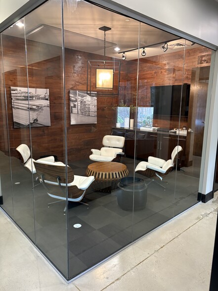 The building has high-end finishes including glass walls between the offices and the interior halls, brick accent walls in the executive offices and conference rooms, solid wood interior doors, and insulation in the interior walls between offices to offer additional privacy.
