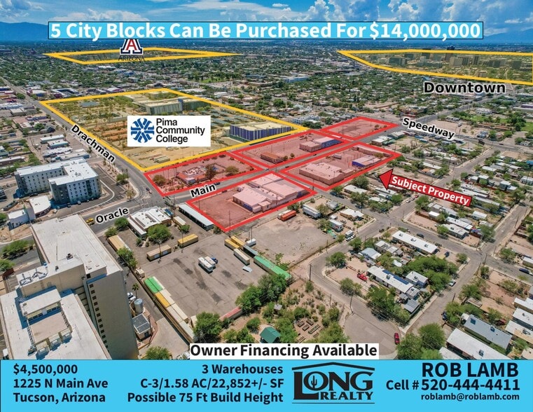 Warehouses for sale next to Pima Community College. Perfect property for Owner User, Investor, or redevelopment. Tenants are Month to Month. Lot is 1.58 acres is zoned C3 and has a possible 75 foot build height. Property features 3 warehouses 7,000 SF, 4,300 SF, & 11,552 SF a total of 22,852 +/- SF. Owner financing available.