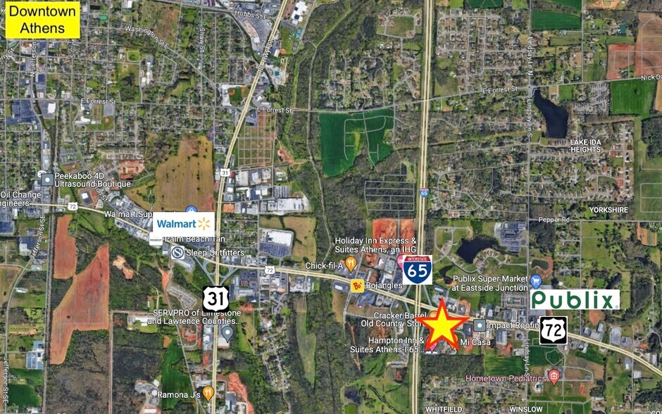 1.9 acre secondary lot at the intersection of I-65 and Highway 72. Zoned B-2. Sewer available. Located in Limestone County, Alabama’s fastest growing county. With a highly educated work force, wealth of training resources and attractive business incentives, Limestone County is the ideal location for industrial and retail growth. Home to diverse industries including aerospace, advanced manufacturing, automotive, biotechnology, and robotics, the county is well-positioned to welcome more. Limestone County is also home to five Fortune 500 Companies: Tenneco Polaris Steelcase WestRock Target Distribution Center