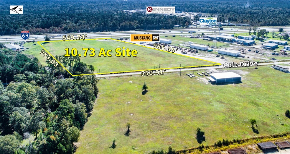 10.73-Ac offering excellent frontage and I-69 (Hwy 59) visibility adjacent Mustang Cat Equipment Rental Center. Property has additional access from Cole Drive. Utilities provided by City of Splendora