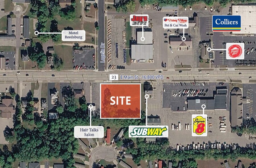 : 0.86 acre site on E. Main Street in Reedsburg, WI. This site offers strong visibility along a 16,800 VPD corridor and is zoned B-2 Business, suitable for a range of retail or service uses. Neighboring retailers include Walgreens, Jay’s Power Center, Casey’s Convenience Store, Subway, McDonalds, and Kwik Trip.