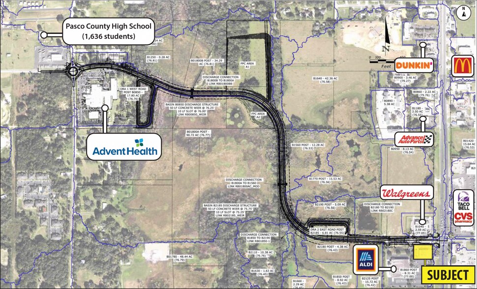 -0.96 acres with a 10,000 SF building available at signalized intersection -Shopping Center anchored by ALDI -175’ of frontage along US Hwy 301/US Hwy 98 (28,000 AADT) -Morningside Rd is going to extend through to Fort King Rd and connect into Advent Health Hospital and Pasco County High School (1,636 student count) -Construction of Morningside Rd extension expected to begin in 2026 and open in 2027 -Brand new Ford Dealership and Chick Fil A going directly south of subject site -6,576 homes under construction and 1,823 homes in permitting within a 3-mile radius of site -Local retailers include: Winn Dixie, Walmart, Publix, CVS, Walgreens, Chick Fil A, McDonald’s, Burger King, Taco Bell, Dunkin, KFC, Checkers, ACE Hardware, Mavis, 7-11 & Circle K