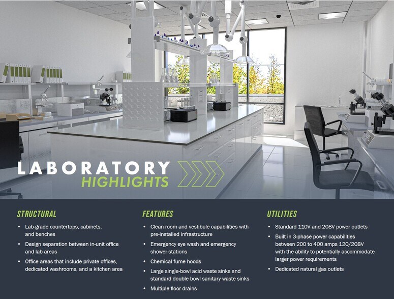 - Advanced lab features including clean room capabilities, chemical fume hoods, and emergency wash stations.