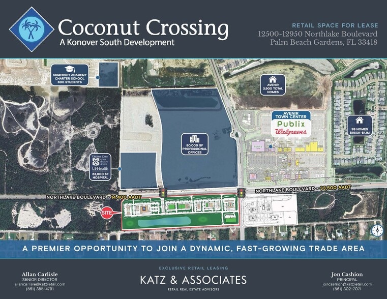 • First generation retail, restaurant, and office space available • Coconut Crossing is a new 100,000 SF Class A retail center located at the signalized southwest corner of Northlake Blvd & Coconut Blvd in affluent Western Palm Beach County • Join Aldi, Starbucks, Wendy's, Marco's Pizza, Fifth Third Bank, 7-Eleven • Currently under construction and slated for Q4 2025 delivery • Directly across the street from Avenir, a master-planned community featuring 3,900 residential units, 400,000 SF of retail anchored by Publix, 2M SF of office space, a premier golf course, and 200,000+ SF of medical facilities. • Strong trade area with 30,000+ existing residences nearby and an additional 15,000 homes in various stages of development, exceeding well over $150,000 per household