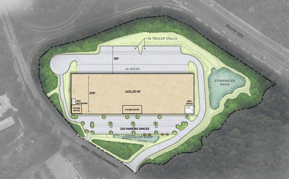 Strategically positioned within the prestigious West Creek Business Park, this ±221,231 SF Class A industrial spec building offers unmatched access and infrastructure for modern logistics and distribution operations. Located in Goochland County, the site benefits from a business-friendly environment and a real estate tax rate 43% below the Richmond metro average. The building features 32' clear height, 46 dock positions with 9'x10' doors, 8 docks with 35,000 lb mechanical levelers, and 2 oversized drive-in doors. Electrical capacity is robust with 3,000 Amp 480/277V service, complemented by LED lighting designed to achieve 30 foot-candles at 36" AFF. The slab is 6" unreinforced concrete rated at 4,000 PSI, and the facility is equipped with ESFR sprinklers. Designed for operational efficiency, the site includes ±230 auto parking spaces and 36 trailer stalls. Clerestory windows enhance natural light, and column spacing of 54' x 52'6" with a 60' speed bay supports flexible racking and workflow layouts. A 1,945 SF spec office is located on the south end, with two speculative restrooms on the north end. The location offers immediate access to Route 288 and is within 5 miles of I-64 and I-295. The Richmond Marine Terminal and Richmond International Airport are just 25–28 miles away, supporting regional and national distribution. The surrounding area boasts over 34,000 businesses and a labor force exceeding 561,000, with an average household income of $126,275.