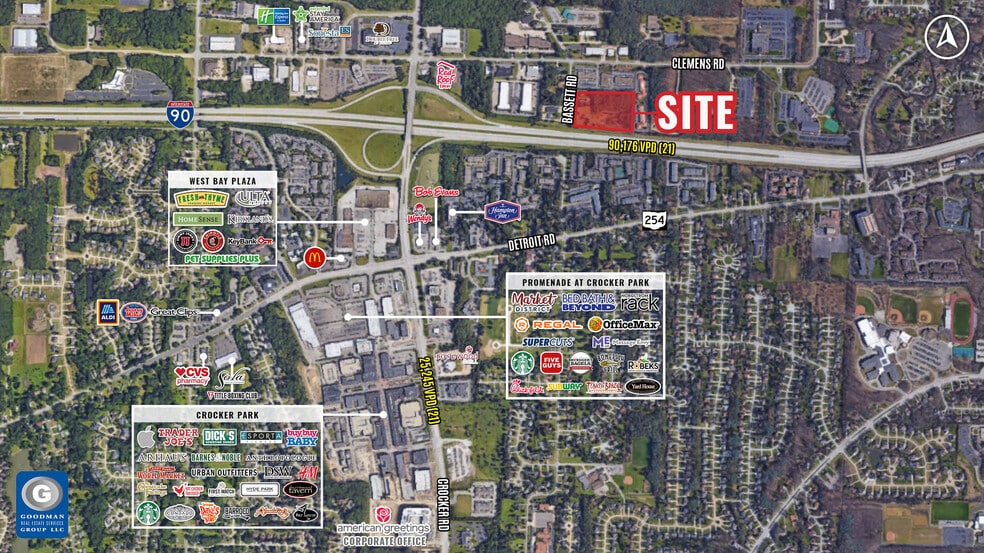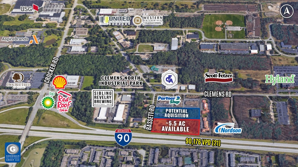 Approximately 5.5 acres located at 1295 Bassett Road For sale: $1,950,000 Approximately 768’ of frontage on Interstate 90 Minutes from Crocker Park and located just off of the Crocker Road exit on Interstate 90 Excellent corporate office location Highway visibility Owner will also consider build to suit