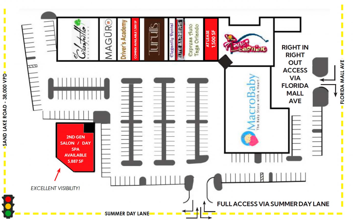 - 1,500 SF Corner Space Coming Soon - Excellent Frontage/Visibility on High Traffic Sand Lake Road, with 38,000 VPD & off the Corner of Orange Blossom Trail with 58,000 VPD - Abundant Parking Available, 233 Convenient Parking Spaces throughout the Property - Prominent Shadow Center to the 1.7 Million SF Florida Mall, Attracting 20 Million Visitors Annually