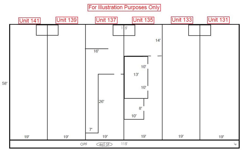 - Unit 141 is 1,112 SF. End Cap Unit. Open Configuration with 1 ADA Restrooms.