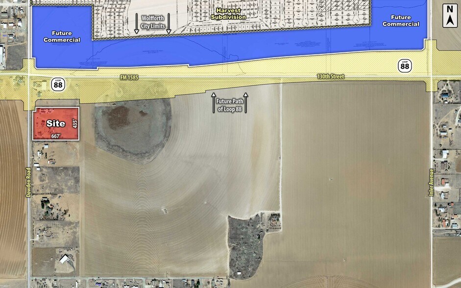 The property is located at 13105 S FM 179 in Wolfforth, Texas, along a major north-south corridor that connects to Lubbock and surrounding residential areas. It is near the planned Loop 88, which will further improve regional access. The site is outside city limits and within Frenship ISD, an area with ongoing residential development.