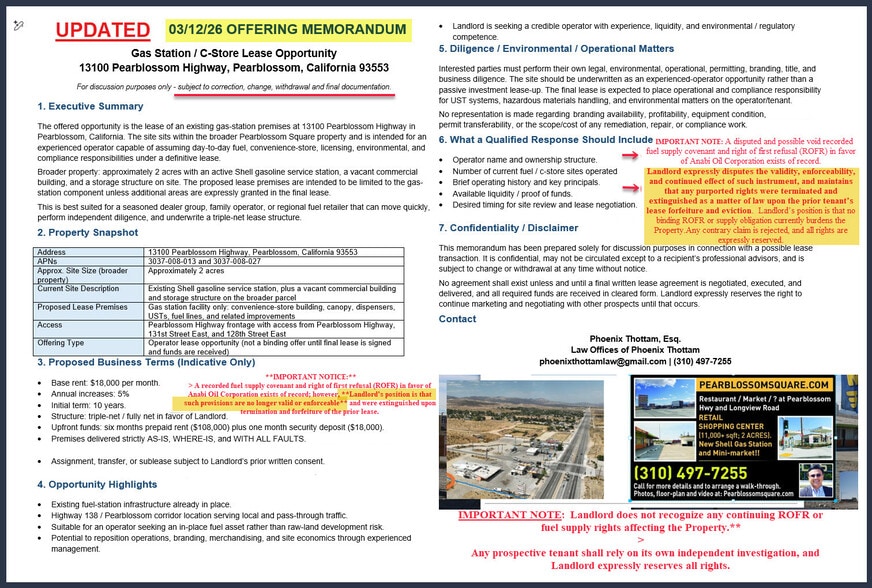 Pearblossom Square offers a rare opportunity to control a signalized commercial corner on Hwy 138 with existing improvements, excess land, and repositioning upside. The combination of gas station infrastructure, warehouse-style retail space, fenced yard area, and buildable potential creates flexibility for retail, service, storage, travel center, or redevelopment concepts.