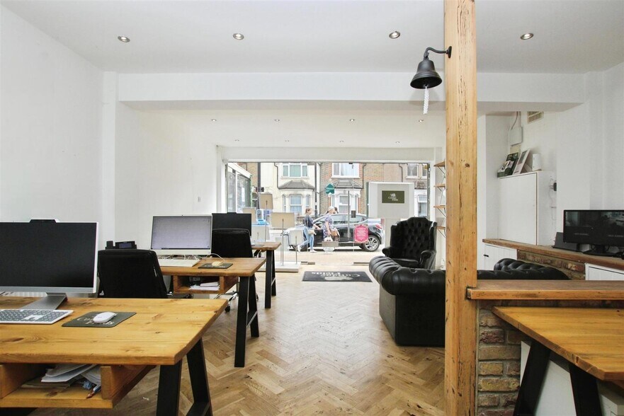 Step through the full-height glass frontage into a beautifully lit, contemporary commercial space where modern design meets versatility. The bright, open-plan front office area immediately impresses with its floor-to-ceiling glazing, creating an airy, welcoming environment flooded with natural light, the perfect setting to meet clients, showcase products, or run a creative studio.