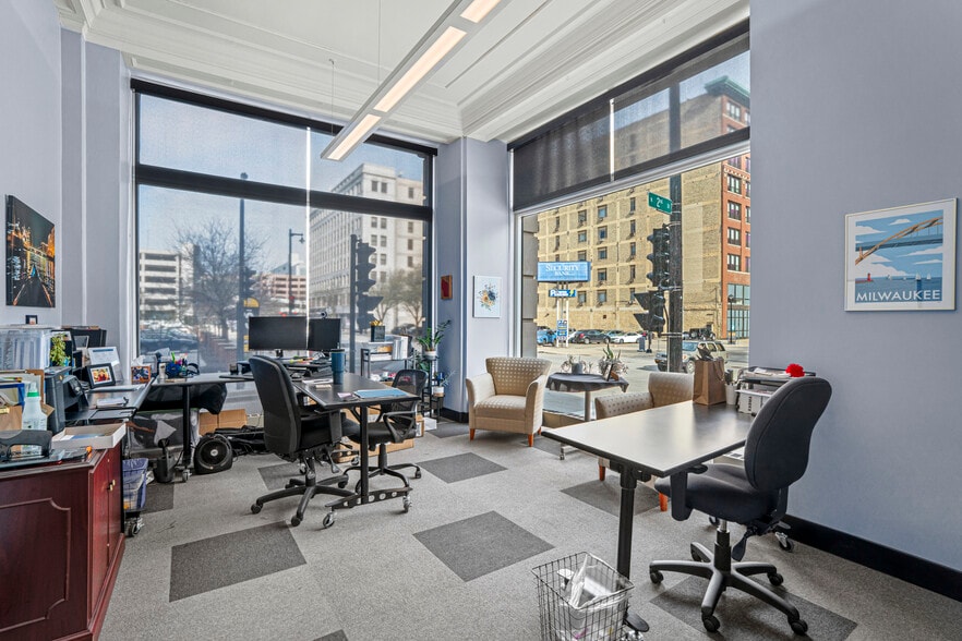 High-Visibility Professional Suite Prime Location: Situated at the high-traffic intersection of Wells St & Plankinton Ave (5M+ annual visits). Immediate proximity to the Milwaukee Riverwalk and 3rd St Market Hall. Move-In Ready: Fully built-out interior featuring 8 private offices, 2 kitchenettes, and a private restroom. Exceptional Light: Floor-to-ceiling 12' windows provide abundant natural sunlight throughout the space. Accessibility: Includes a private street entrance for exclusive access and parking availability (garage and surface lot) within one block.