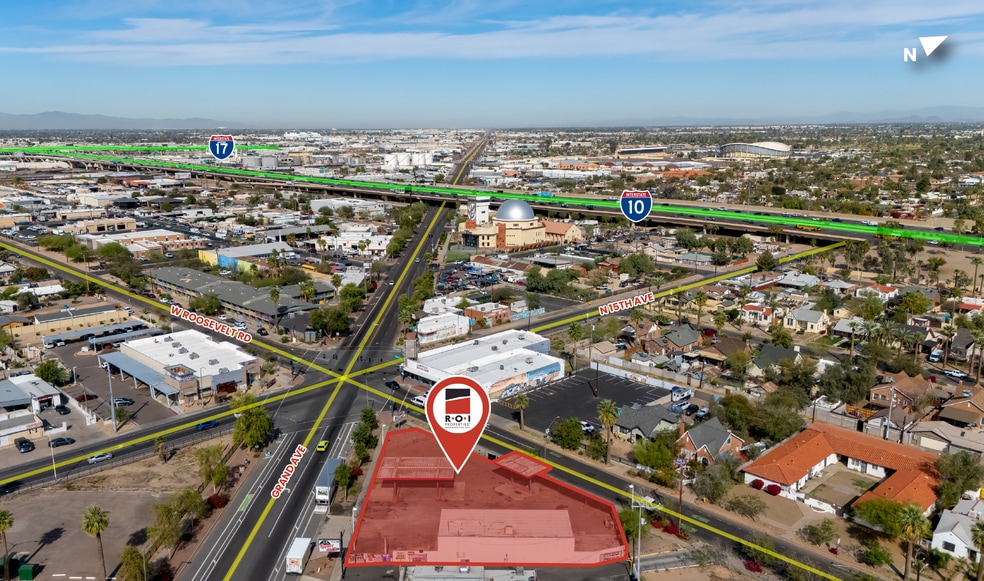This premier corner location in the heart of the Grand Avenue Arts District offers an exceptional opportunity for an automotive dealer, repair facility, or body shop. Situated at the high-traffic intersection of 15th Avenue, West Roosevelt Street, and Grand Avenue, the property features a ±1,559 SF building with three bays and prominent visibility. The site consists of two parcels with versatile C-3 and R-5 zoning, providing the flexibility required for intensive automotive uses. With convenient ingress and egress on both Roosevelt and Grand, and immediate proximity to major freeways and Downtown Phoenix, this location ensures seamless access for customers.