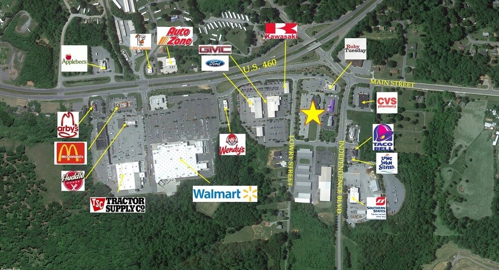 1,200sf unit currently configured into office space with reception area, conference room, 4 offices, bathroom. Front and rear entrances. Large paved parking lot. Central location convenient to U.S. 460 and U.S. 221.